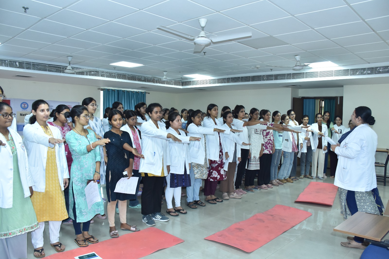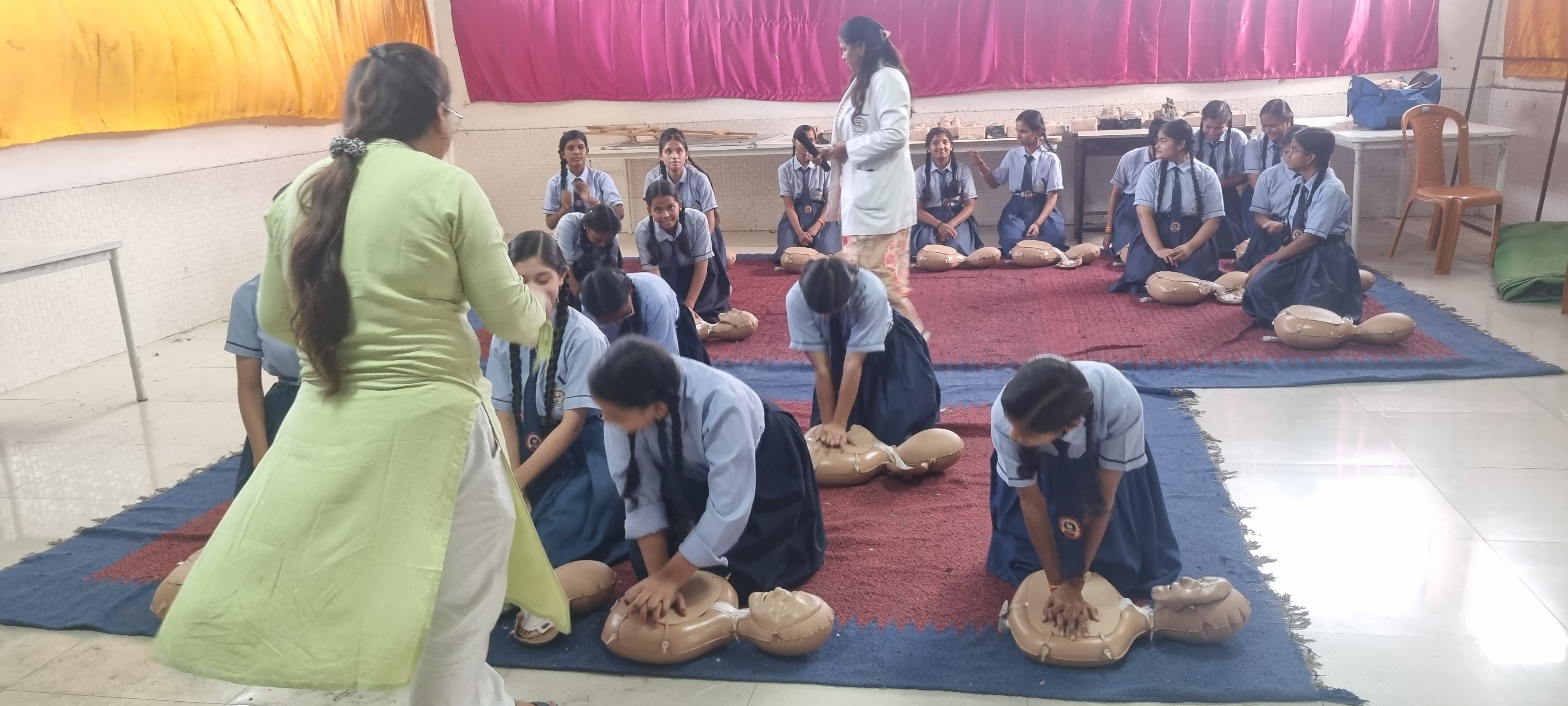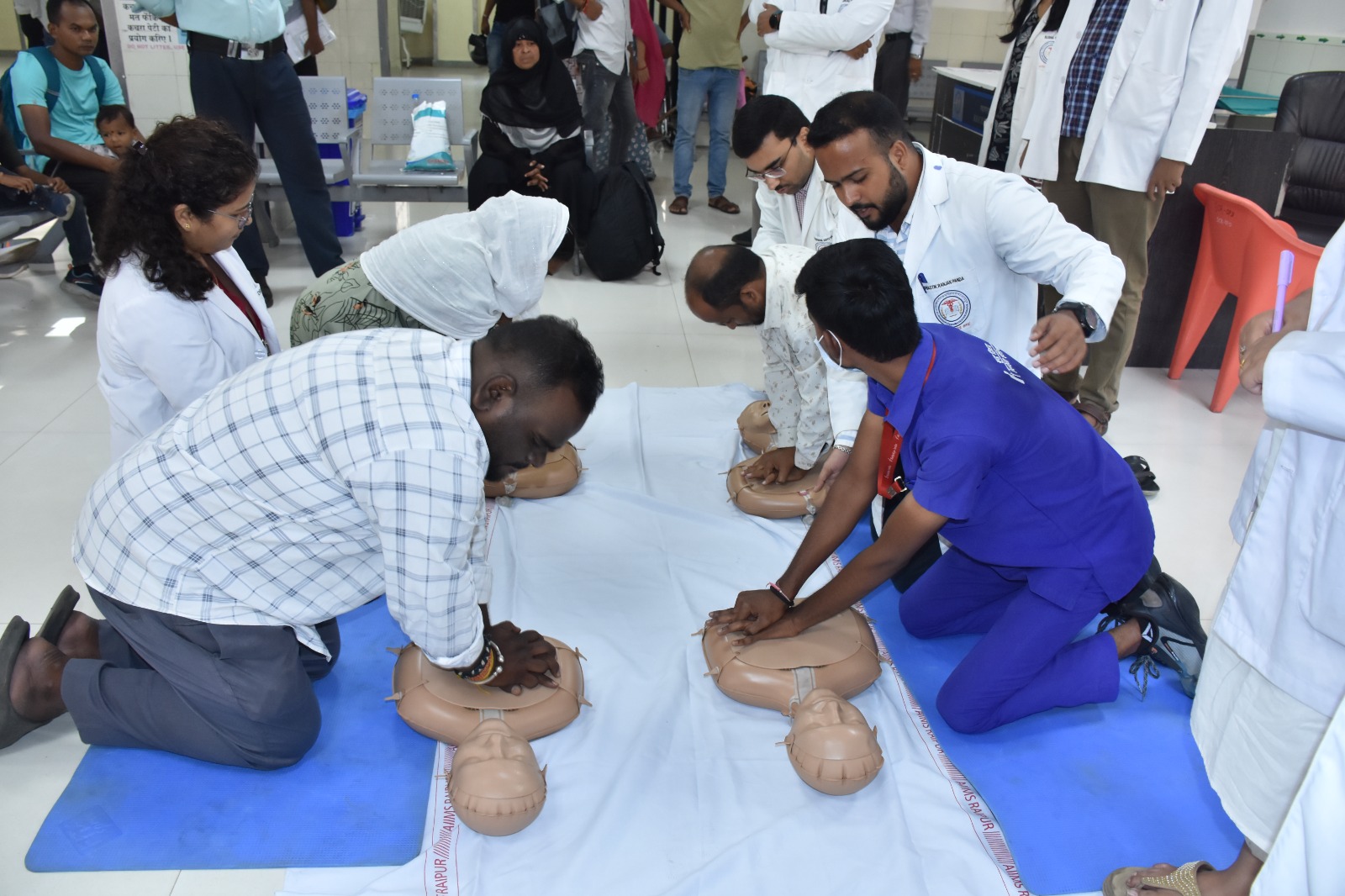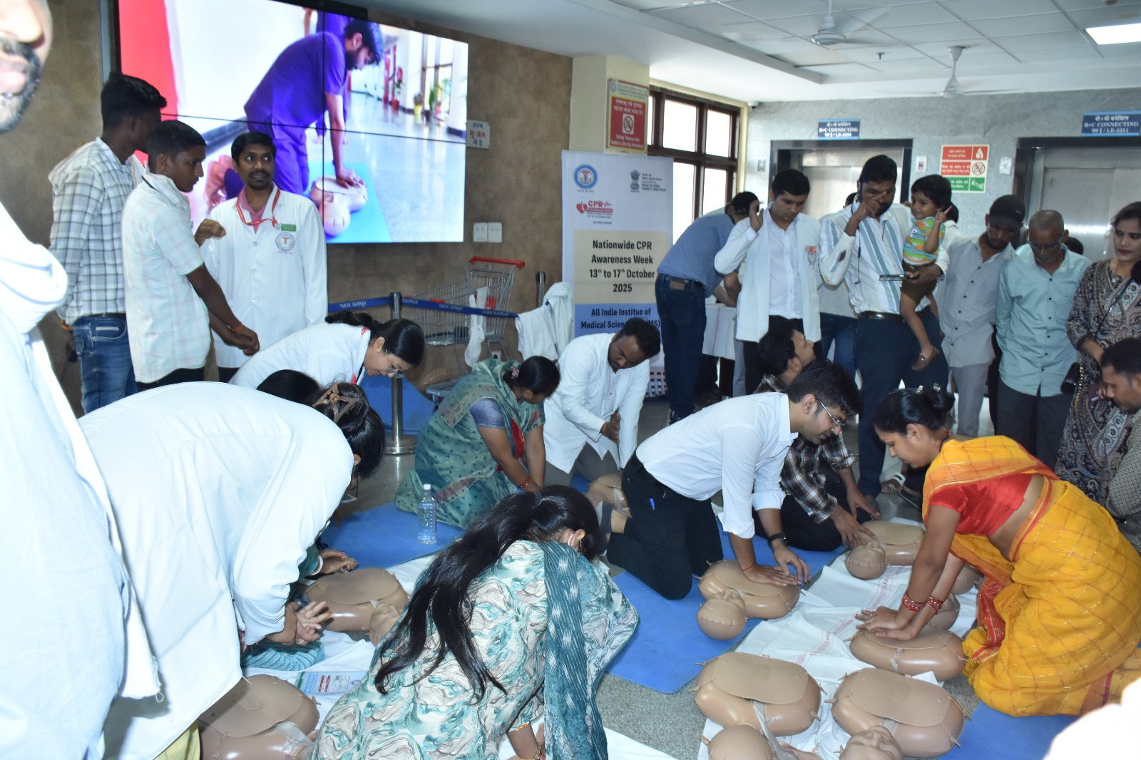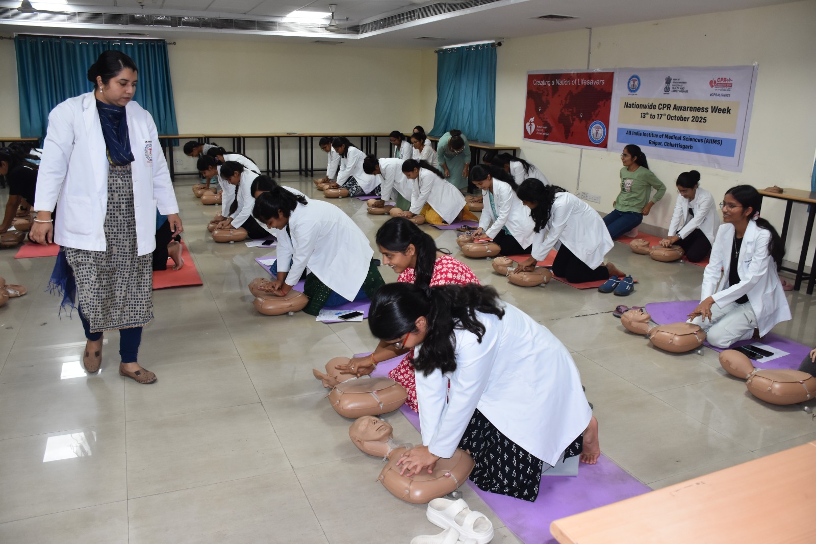 A Nationwide CPR Awareness Week from 13th to 17th October 2025 under the agies of Ministry of Health and Family Welfare was celebrated at AIIMS Raipur with full enthusiasm. Thisincluded a series of activities aimed at sensitization, training and community engagement. We have conducted following activities during this week • A CPR awareness booth was installed at the Registration Central Dome area, AIIMS Hospital for awareness of lay persons visiting OPD. Demonstration videos of Hands-only CPR were displayed on large LED Screen attracted the attention of lay persons visiting OPD throughout the week. Master trainers conducted Hands-Only CPR (HOCPR) training of OPD visitors at this booth. • Second CPR awareness booth was installed at AIIMS OPD screening Area to conduct HOCPR training of community members. People were very much interested to learn Hands-only CPR using Manikins. • Third CPR Awareness Booth was installed at UHTC, Ramnagar Raipur also attracted visitors attention. People learned HOCPR and practice it on Manikins there also. • Fourth CPR Awareness Booth was installed at RHTC, Civil Hospital, Kurud for HOCPR training of OPD visitors in rural set-up. • We organized HOCPR training for medical and nursing students, non-teaching staff as well as school children of Sages Shahid Smarak School, Raipur. • Cumulative number of participants trained in HOCPRthroughout this week was1545,One thousand, five hundred and forty five beneficiaries including OPD visitors,Medical students, Nursing students, Non-teaching staff, and School children. • We did live streaming online Pledge by Secretary, MOHFW on Day-1. Students of First Year MBBS 2025 batch and faculty members took pledge in gracious presence of Dean Academics, Prof (Dr) Eli Mohapatra.Live streaming of Panel discussion organized by MOHFW was done on Day-2. Our Executive Director & CEO, Lt Gen Ashok Jindal graced this occasion. • E-Poster and E-Slogan competition: We have organized E-Poster and E-Slogan competition on the theme, CPR techniques and importance of CPR/ need and role of bystander CPR for MBBS, Nursing, PG and PhD students. We have received good response from the students for this competition. Dr Anil Kumar Goel was the judge for these competitions.Chiranjeevee Gharde from PG /PhD group, Dhruv Nirapure and Pragnya Kumari from MBBS group and Sneha Bhardwaj from Nursing group won the prize in these competitions. • Concluding Ceremony: Role Play by MBBS students & Certificate Distribution A Role Play with theme of Awareness for Bystanders CPR was played by 2nd year MBBS students, Parinita, Hrishabh, Lakshy, Nilay and Puneet in Central Dome Registration area. People watched it with curiosity and practiced HOCPR after Role play.Certificates were distributed to the Winners of E-Poster and E-Slogan competition as well as students who performed Role play. Medical Superintendent, Dr Renu Rajguru and Additional MS Dr Nitin Borkar graced this Concluding ceremony. • The Nationwide awareness week was conducted under the guidance of our Executive Director and CEO, Lt Gen Ashok Jindal. A core committee of Dr DK Tripathi, HOD Trauma & Emergency Department, Dr Anil Kumar Goyal, HOD Pediatrics and Dr Jayshri R Ghate, Professor Physiology was formed for smooth conduction of this activity. Various faculty members of Trauma & Emergency Medicine Department Dr Naman Agrawal, Dr Chandan Kumar Dey; Physiology Department Dr Arunita Jagzape and Dr Dipali Chatur; CFM Department Dr Ashwini Katole, Ashish Khobragade, as well as SRs Veena, and Purva, along with JRs and interns supported the whole program. Nursing officers Mr Anish, Mrs Prakash Mr Sipa, Mr Ganesh, Mr Vijay, Mr Bhimrao, Mrs Prabha and many more nursing officers as well as project fellow Ms Archi Sahu conducted training at awareness booth as master trainers. TheMedical Superintendent, Dr Renu Rajguru, Additional MS Dr Nitin Borkar, Deputy MS, Dr Dibakar Sahu and Dr Nitin Kashyap helped in logistics. Overall program was coordinated by nodal officer Dr Jayshri R Ghate, from Physiology Department. • Thus it was a successful conductionNationwide CPR awareness week With regards Dr Jayshri R Ghate Nodal Officer Professor, Physiology AIIMS Raipur